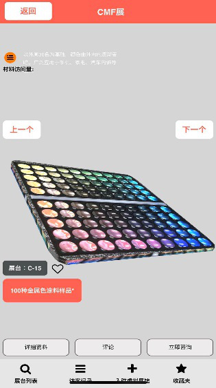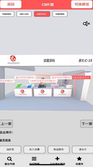 扫描上记二维码下载寻材问料APP→进入APP点击右上方虚拟展馆→点击CMF展→选择创新色彩区→点击金彩汇涂料(展台:C-15)即可进入