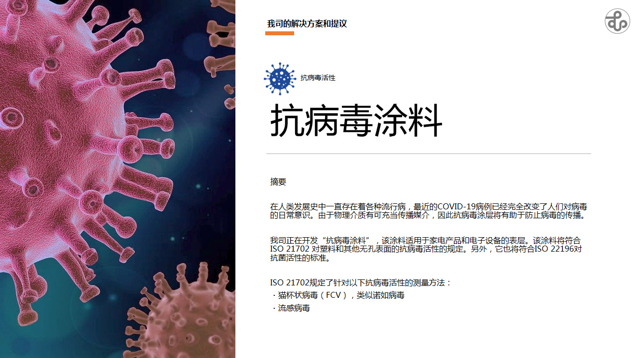 在现有具有抗菌功能的涂料的基础上,切合当下疫情各厂家也推出了具备抗病毒功能的产品。金彩汇涂料同样勇于承担此社会重任,适时研发、生产具备此类功效的涂料产品。