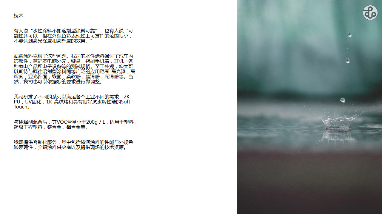 降低VOC危害除了高固体份涂料之外,水性涂料同样是一种很好的解决方案。经过多年的发展,在汽车外饰、木器以及建筑上已经有了广泛地应用。但是由于性能以及使用过程中对于新增设备投资需求等因素,相比在3C电子包括汽车内饰部件方面的普及程度依旧偏低。金彩汇涂料近些年针对这些弊端,在集团的潜心研发下目前已有多款不属于传统溶剂型涂料的产品,覆盖了1K、2K、UV以及塑料、金属都能较好使用的产品。