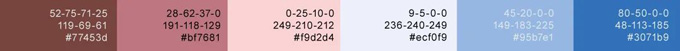 色彩分析:粉色系是山桃花的主色,是蓝色系的对比色。明度较高的粉蓝搭配起来给人浪漫、温柔的印象。