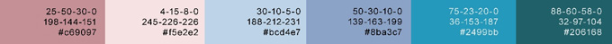 色彩分析:采用粉红色和蓝绿色的对比色搭配,色调淡浊,给人淡雅、柔和的印象。