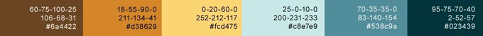 色彩分析:采用纯度较高的棕黄色搭配蓝色系,较大的明暗差异给人精致、华丽的印象。