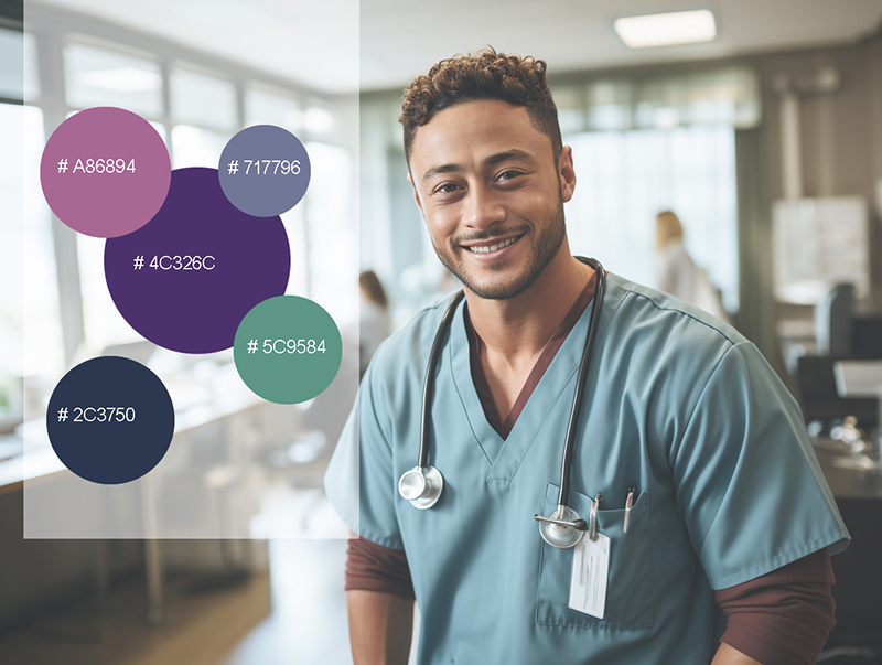 因为工作需要Adams长期穿着工作服,以蓝绿色系和紫色系居多.但他自己平时也倾向于选择这样的色彩,他觉得蓝绿色能带给他平静与希望;紫色系则可以给人传递出温馨与轻松的氛围。按照Adams的需求与倾向,我们提供出以下色彩方案: