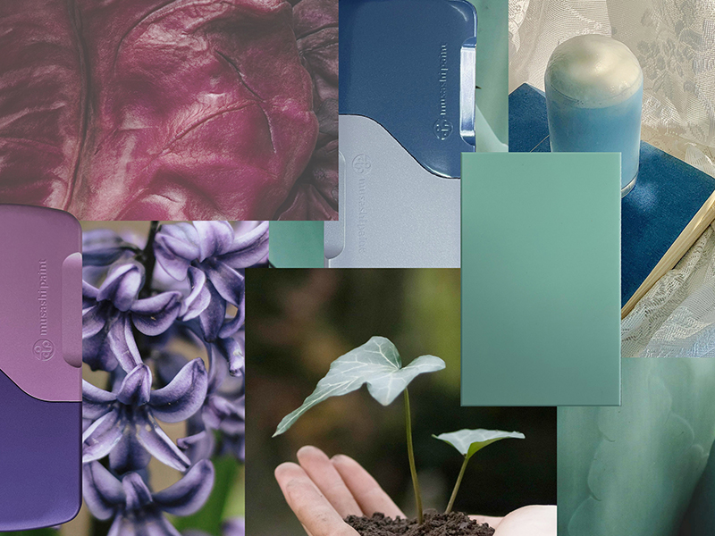 清爽洁净的深空蓝搭配低饱和高亮度的芋紫色树立起专业干练的形象;深邃的天鹅绒紫叠加桃绒手感和同色系的磨砂丁香紫又带给人优雅而灵动温馨的气息;而灵感来自景天科植物的塔基拉蓝搭配爽滑哑光质感立马让人联想到贫瘠沙漠中的那抹生机。